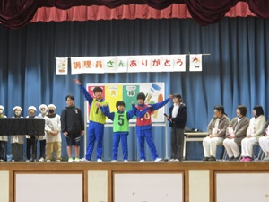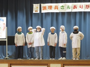 集会では、調理員さんへ感謝の気持ちを伝える呼びかけや給食劇、栄養クイズなどが行われました。