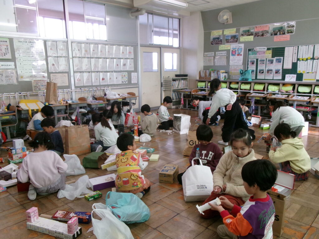 今日の3、4時間目に箱を使って、つなげて重ねて、思いつくまま作品を作りました。この箱は算数の学習「かたちあそび」で使用したもので、自分たちで持ってきた箱を使って、電車、車、温泉、動物などを楽しそうに作っていました。