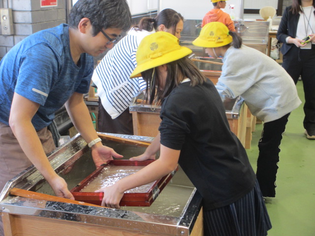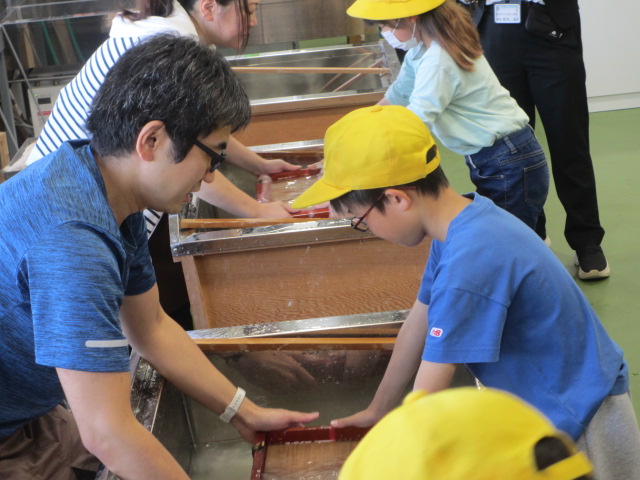 実際に伝統工芸士の方と和紙作りを行い、紙漉きの重さやドロドロとした和紙のもとに触ると