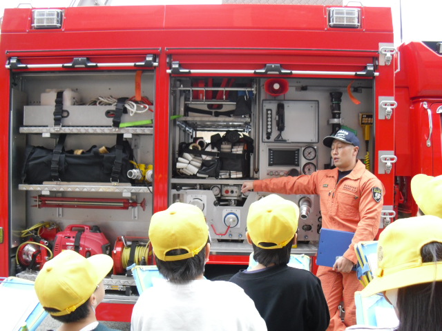 「熊谷消防本部」では、災害から地域を守る消防士さんのお話を聞いたり、消防車の設備を見たりしました。